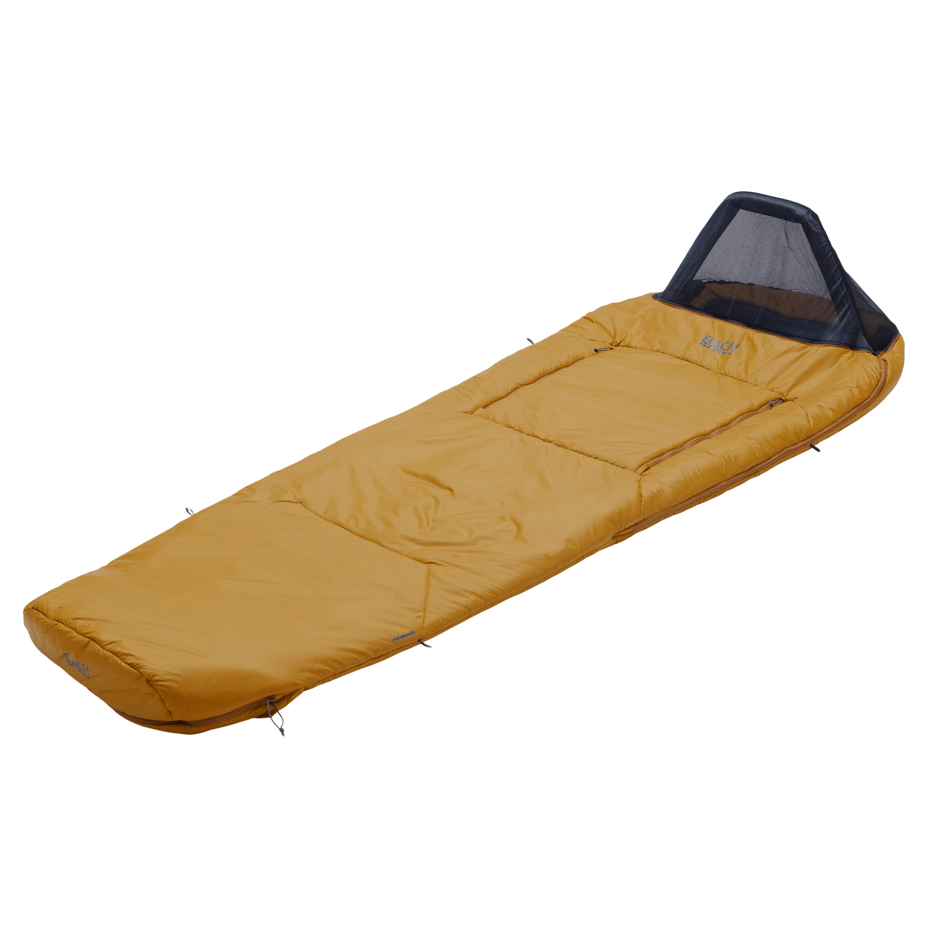 Der Schlafsack ist mit einem aufblasbaren Insektennetz ausgestattet, welches sich in weniger als einer Minute aufstellen lässt. Es schützt das Gesicht vor Mücken und ermöglicht dennoch den ungehinderten Blick auf den Nachthimmel. Dank der strategisch platzierten insektensicheren Belüftungsoptionen genießt man maximalen Komfort und Schutz zugleich. Ebenso kann die Insektenöffnung vollständig geöffnet werden, sodass man das Frühstück ganz entspannt im Schlafsack genießen kann.