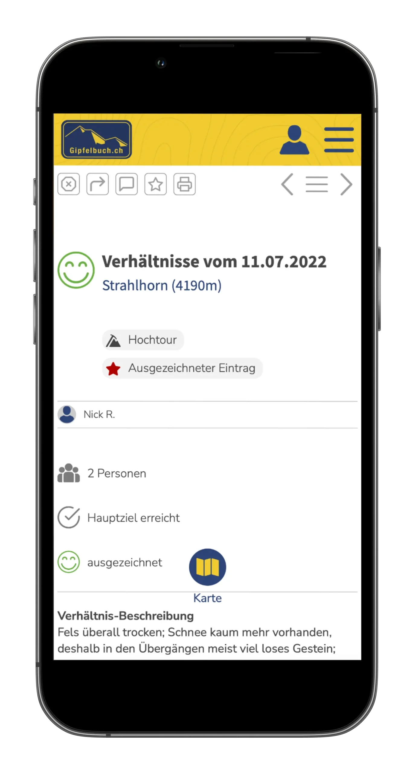 Die neuen Formulare zur Eingabe von Verhältnissen und Routen können jetzt intuitiver und schneller ausgefüllt werden. Und Verhältnismeldungen sind neu auch unkompliziert per Smartphone von speziellen Standorten wie zum Beispiel Berghütten möglich – ohne technische Hürden und sehr pragmatisch dem physischen Papier-Gipfelbuch nachempfunden.