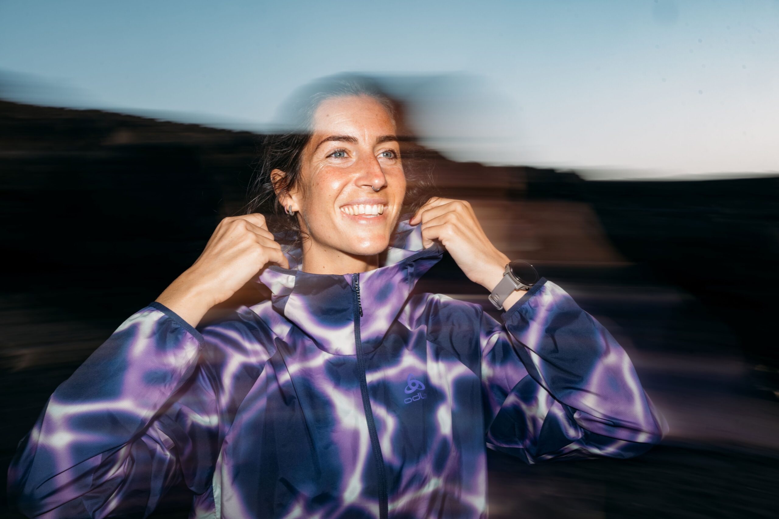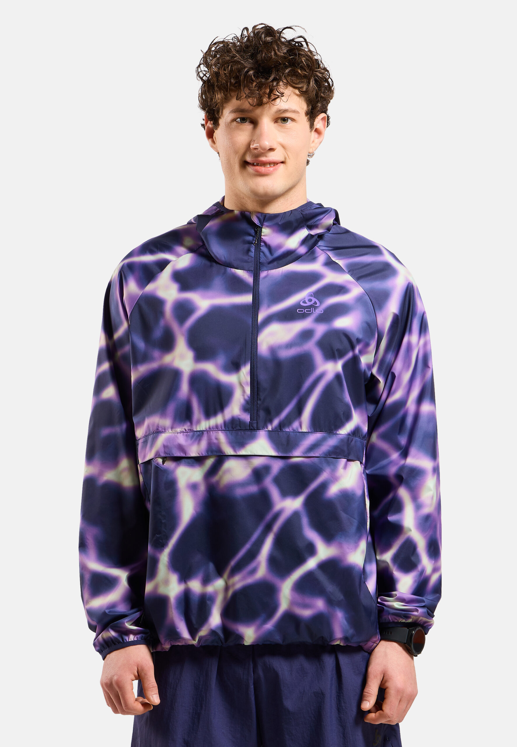 Besonderer Blickfang ist der Print, mit dem die Kleidungsstücke versehen sind. Das Muster erinnert an Reflexionen auf der Wasseroberfläche und leuchtet in Afterparty Purple, der Odlo-Farbe der Saison – ein starkes Design, das Sportbegeisterte inspiriert, alles zu geben.