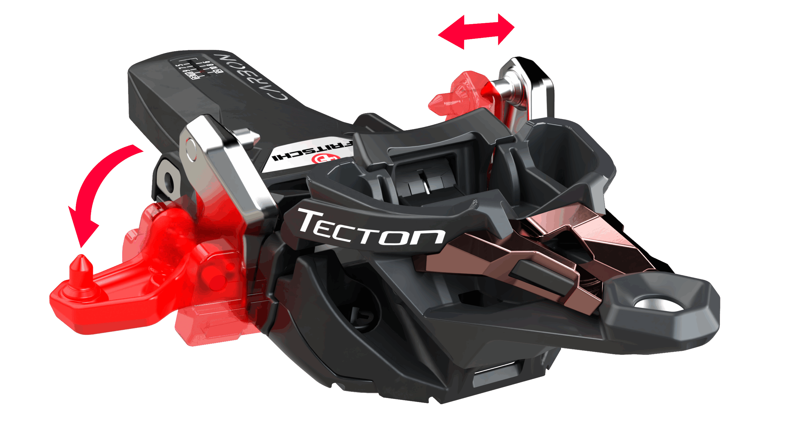 Die Vipec Evo und die Tecton von Fritschi wurden auf dem technischen Konzept der Alpinbindungen entwickelt. Die Seitwärtsauslösung erfolgt vorne, wo die seitlichen Kräfte wirken. Die Frontalauslösung erfolgt in einer fest fixierten Ferse. Bei der Vipec Evo mit integrierten Pins, bei der Tecton in einem Alpin-Fersenbacken. Die langen Federwege absorbieren die seitlichen Schläge vorne und reduzieren das Risiko ungewollter Auslösungen auf ein Minimum. Die festen Hinterbacken sorgen für eine unerreichte Kraftübertragung auf den Ski.