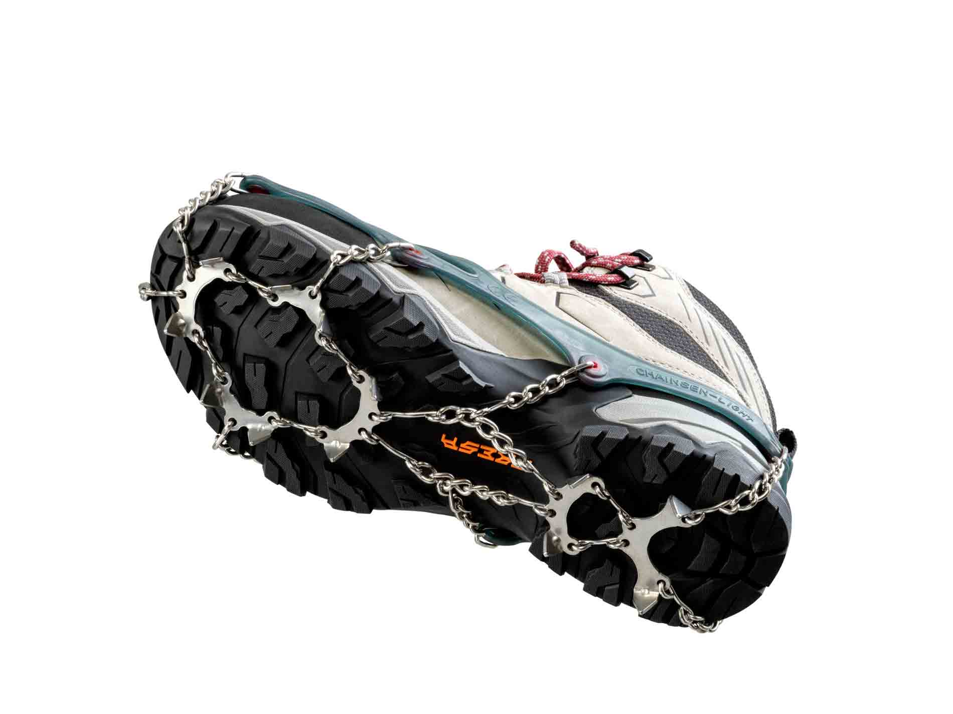 Die Spikes LIGHT sind so ein Helfer. Kaum größer als eine Hand, ab 230 Gramm pro Paar, 12 Millimeter Edelstahl-Zacken, die auf Schnee, Eis und nassem Untergrund greifen. Der Elastomer-Gummi schmiegt sich an Wander- und Trailrunningschuhe, sitzt fest und lässt einen unabhängig des Untergrunds unbesorgt weitergehen.