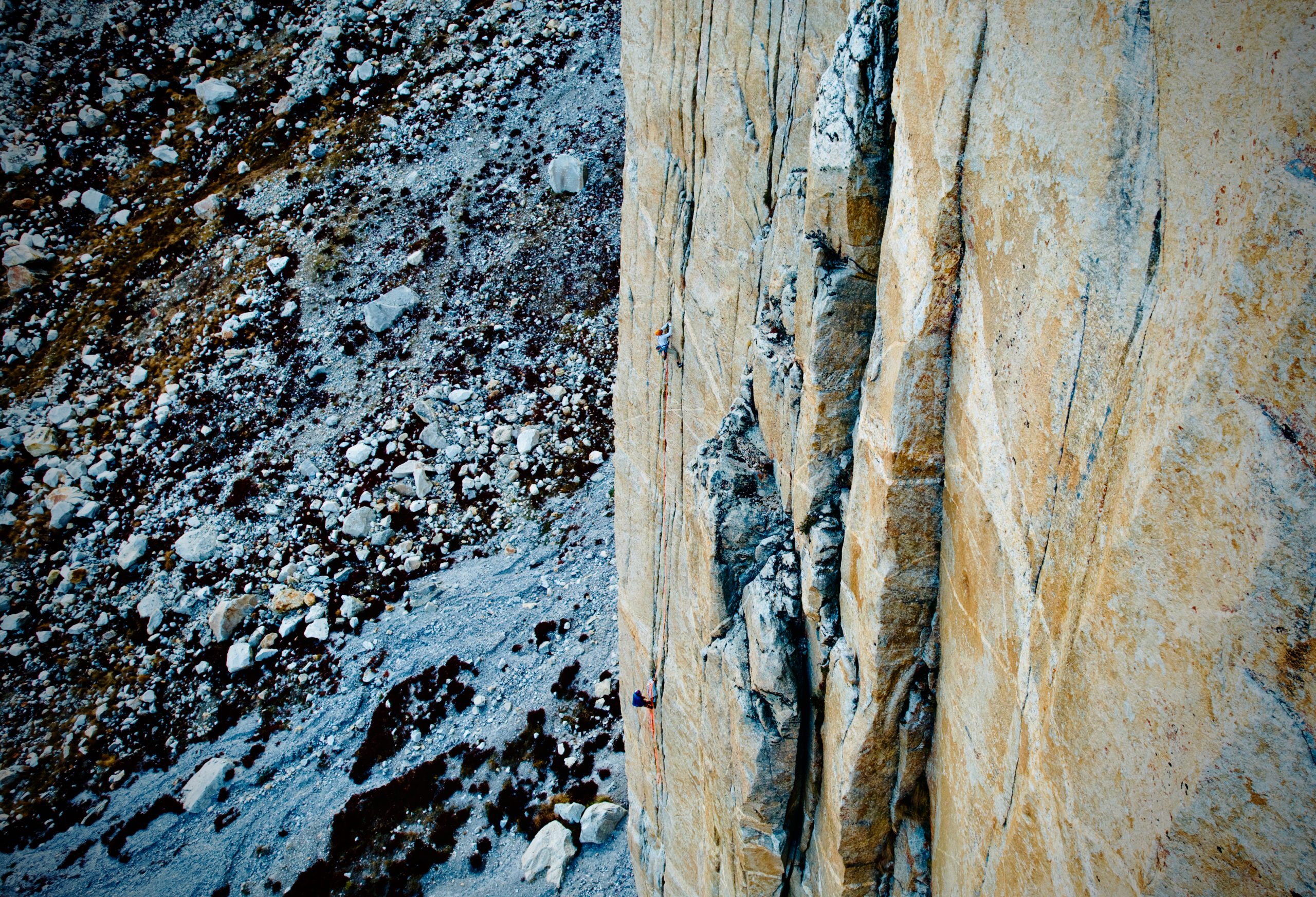 Doch es öffnete sich ein viertätiges Wetterfenster mit ausnahmsweise nur wenigen Zentimetern Neuschnee. Eine Gelegenheit für ein Alternativprojekt, welche wir uns nicht entgehen lassen wollten: Während der Wartezeit im Basislager hat eine Felswand immer wieder unsere Blicke auf sich gezogen. 400 Meter hoch und mit verblüffender Ähnlichkeit zur Nose am El Captain erklärten wir die Felsnase offiziell zu unserem Projekt. Verhältnismässig gut erreichbar, südexponiert und dementsprechend schnell trocken – das ideale Ziel für das kurze Schönwetterfenster. Wir knüpften uns also den 4950 Meter hohen Gipfel am Rande des Kirti-Gletschers vor, den wir «Kirti-Nose» tauften. Auf den ersten 150 Metern bewegten wir uns in perfekter Felsqualität. Traumhafte Risskletterei während den ersten fünf Seillängen. Während den nächsten vier Seillängen trafen wir auf teils lose Schuppen im Fels. Das machte diese Passage deutlich anspruchsvoller. Bis Mitte der 6. Seillänge begegneten wir Spuren eines Erstbegehungsversuches. Das Alter des Materials lässt vermuten, dass der Erstbegehungsversuch in den 90er oder zu Beginn der 2000er Jahre stattgefunden hat. Wer sich aber vor uns an dem Pfeiler versuchte, konnten wir nicht ausfindig machen. Nach dem alten Abseilstand war dann auch kein weiteres Material mehr zu finden. Wir kletterten an den Spuren der Vergangenheit vorbei und wurden dafür belohnt. Auf den letzten 120 Metern genossen wir teilweise steile Wandkletterei mit Felsqualität vom Feinsten. Wir erreichten den Gipfel kurz vor dem Eindunkeln. Nach 10 Seillängen im Schwierigkeitsgrad 7b / A3 und 350 Klettermeter standen wir nach vier Tagen auf dem höchsten Punkt des imposanten Felspfeilers. Glücklich lagen wir uns in den Armen. Dankbar dafür, dass wir trotz zermürbenden Spätmonsunwetter diesen Erfolg feiern durften.
