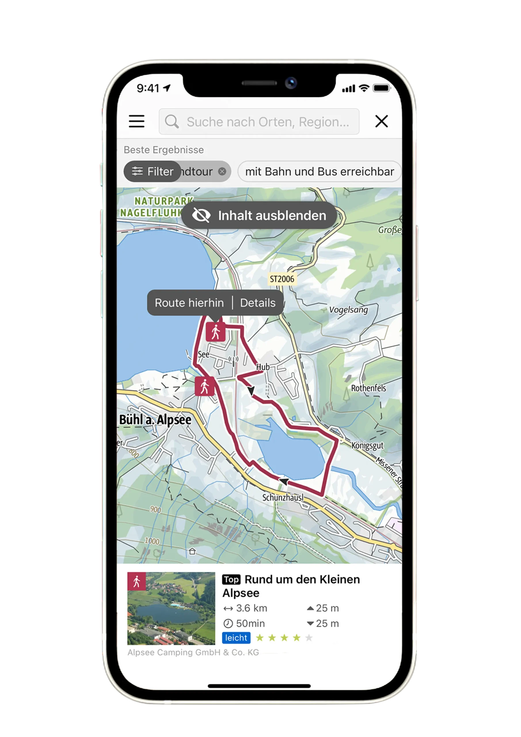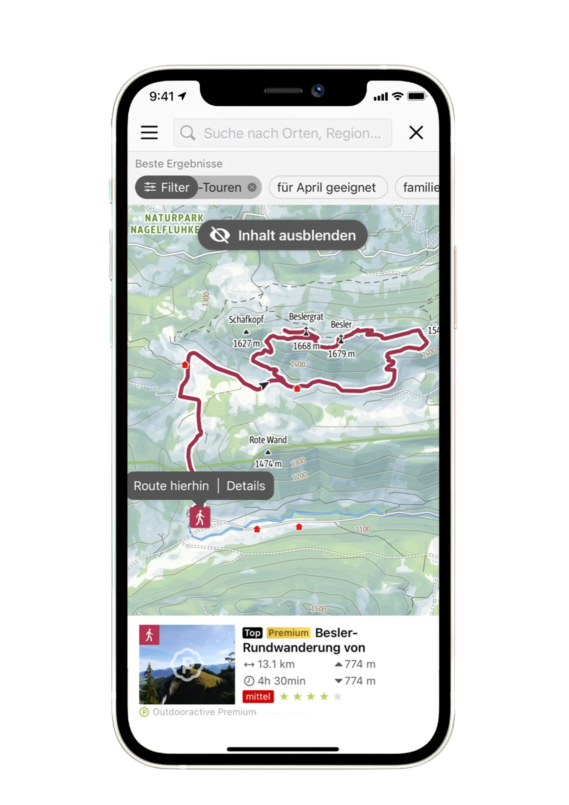 Outdooractive hat genau diese Struktur in ihrer App implementiert, mit interaktiver Kartentechnologie optimiert und auf dem Smartphone erlebbar gemacht. Zusätzlich sind die internationalisierten Inhalte mit interaktiven Services wie Wetter, Webcams und buchbaren Angeboten verknüpft.