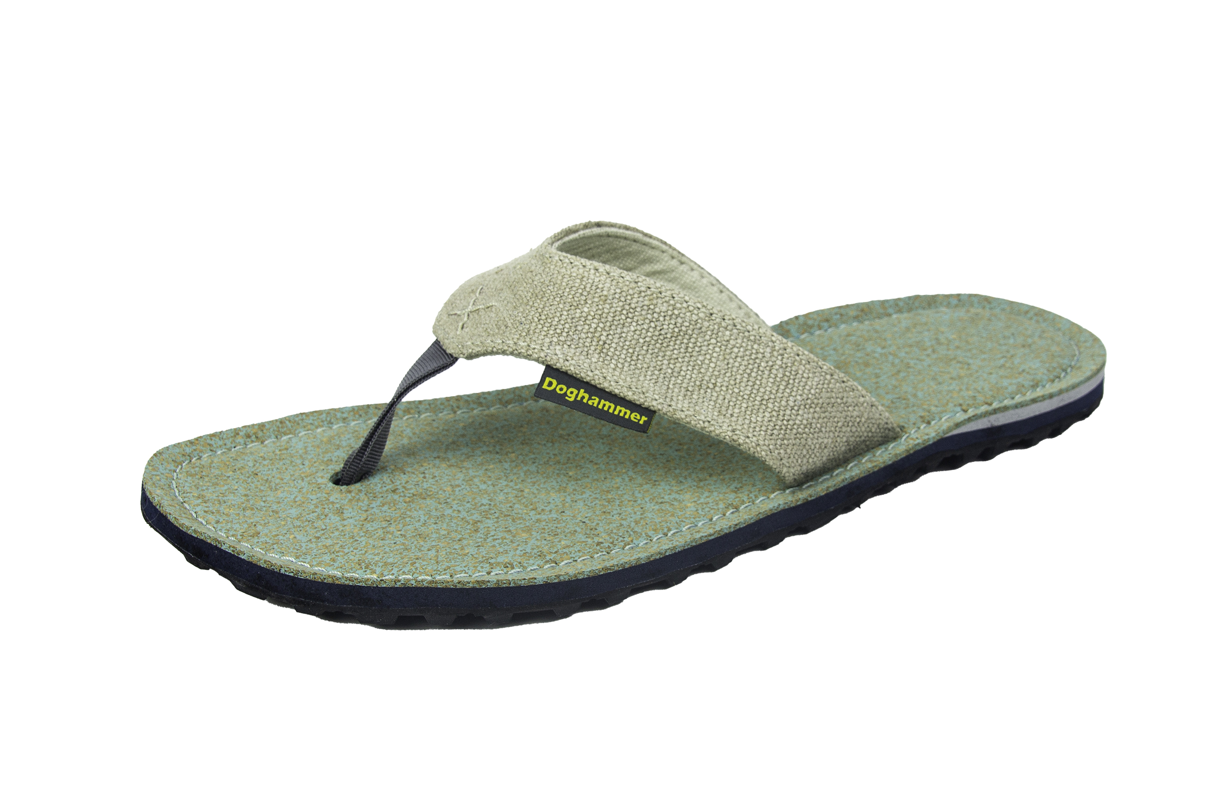 Die Outdoor-Sandale überzeugt besonders durch den durchdachten mehrschichtigen Dämpfungsaufbau bestehend aus einer Naturkork-Gummisohle, einer EVA-Dämpfung mit zusätzlicher Fersendämpfung und dem Obermaterial aus Kork. Die Vibram-Sohle bietet auch bei einfachen Outdoor-Aktivitäten sicheren Halt. Der breite Riemen aus Leinen und Denimstoff weitet sich nicht aus und der ausgearbeitete Zehensteg passt sich angenehm an die Zehen an. Doghammer Schuhe werden in Handarbeit in einer familiengeführten Schuhmanufaktur in Portugal hergestellt.